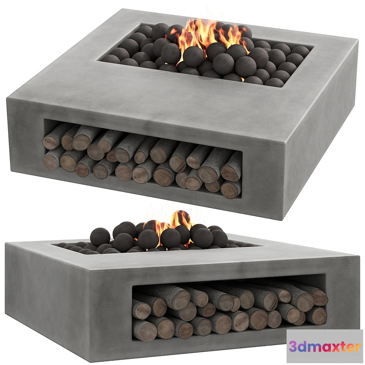 3D model of an outdoor fireplace / barbecue spot for the exterior and outdoor recreation areas filled with concrete fire balls and 24 unique firewoods as well as fire. Material: matt ground concrete.