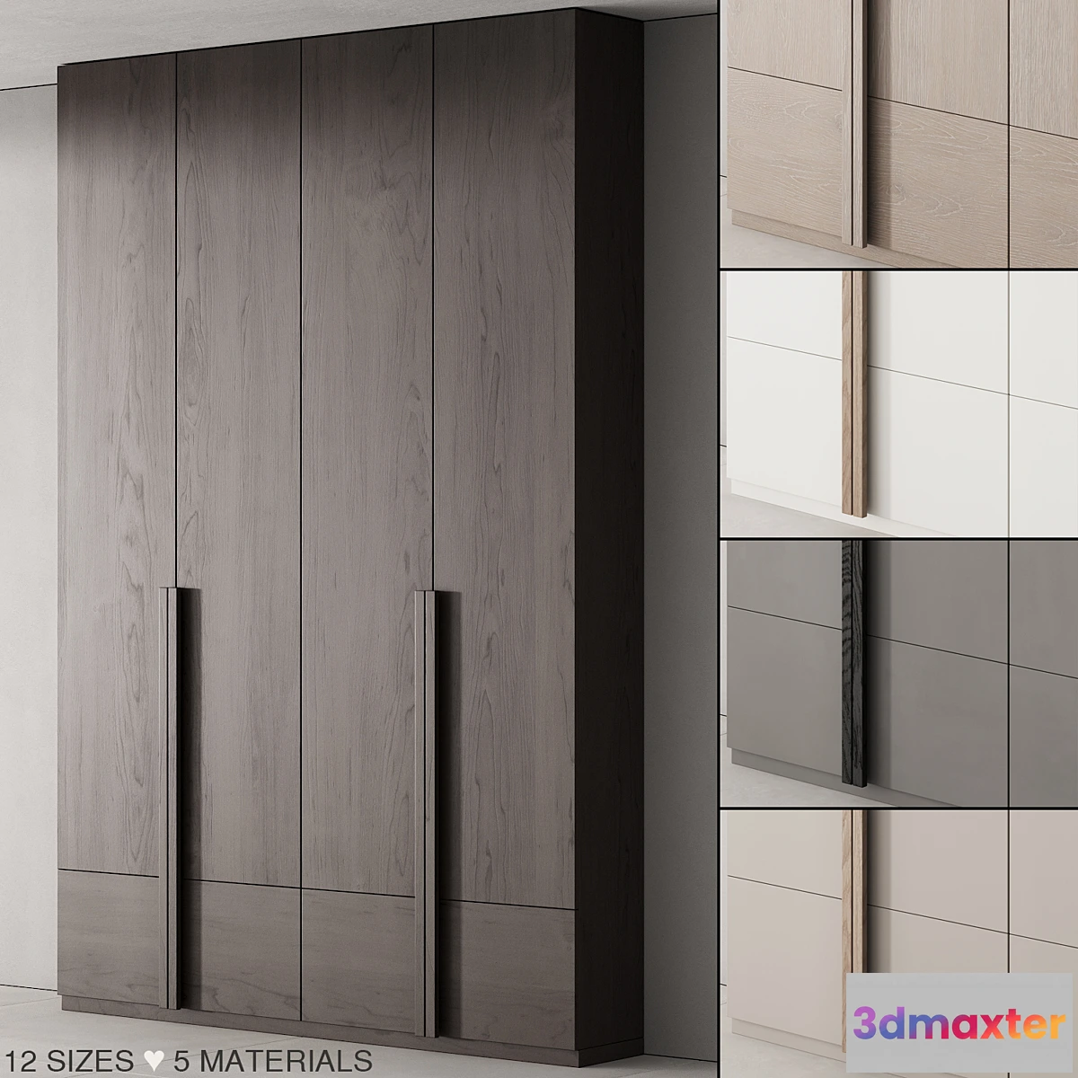 3d model of a floor cabinet / wardrobe made in 12 different sizes and 5 different materials (demonstrated in the second preview) for use in a modern / minimalist / scandinavian / japandi / wabi sabi interior.