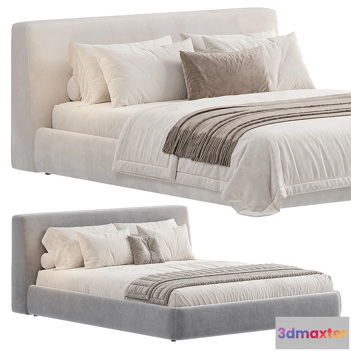 Altea Bed 3D Model is a three-dimensional representation of a contemporary sleeping platform designed for modern residential spaces. This digital furniture asset features a cushioned headboard construction with beige and grey color variations, complemented by crisp white bedding elements and taupe textile accessories. The model showcases a minimalist design philosophy through clean, geometric forms, soft fabric frame detailing, and sophisticated material textures, creating an atmosphere of refined comfort and architectural elegance.