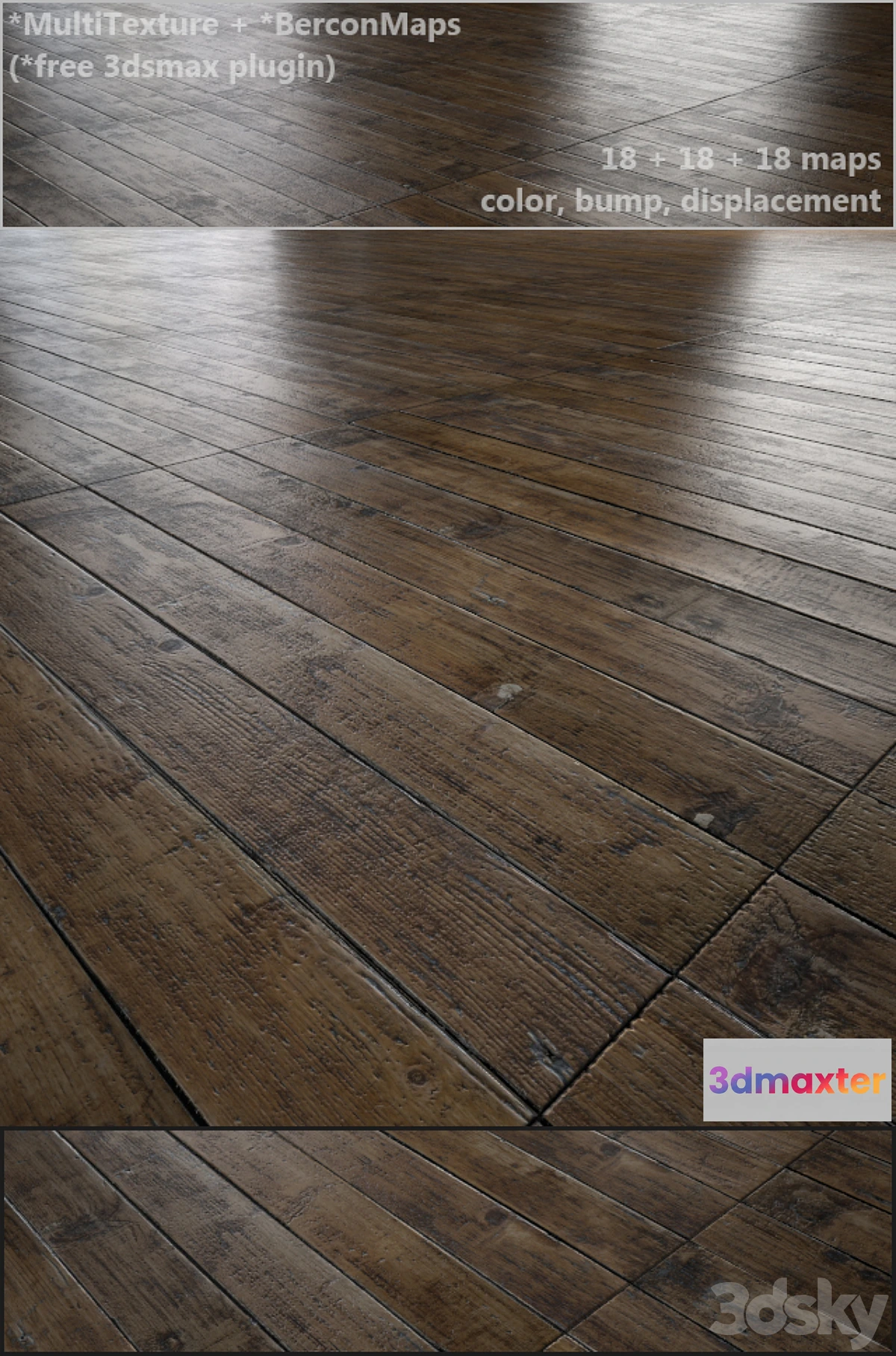 Floor geometry with V-ray MultiTexture material. -18 + 18 + 18 floorboard maps (color bump displacement + extra map). “MultiTexture” and “Berconmaps” plugin needed. (Resource link inside)