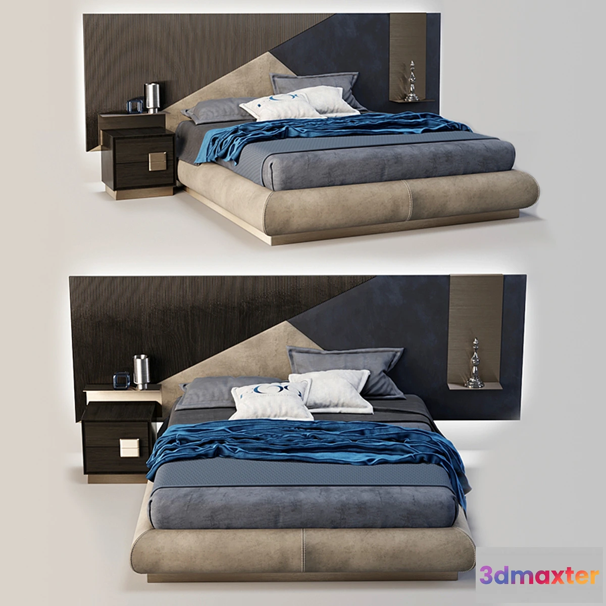 Double bed with headboard composed of wooden and upholstered in nubuck elements. The shelves are made of metal of light bronze color. The base is also upholstered in nubuck.