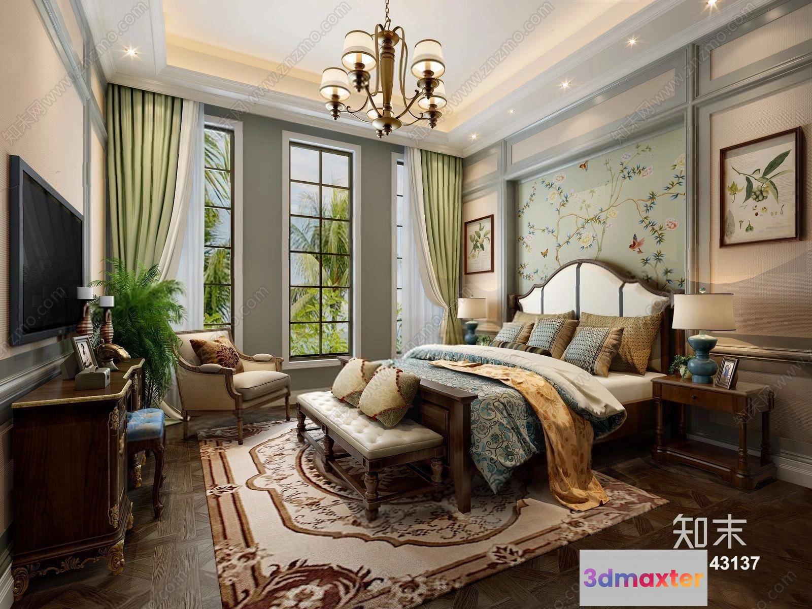 3D Models / 3D Scenes / Interior / Bedroom / Bedroom 3D Interior Scene – American Style – 011 3D Max