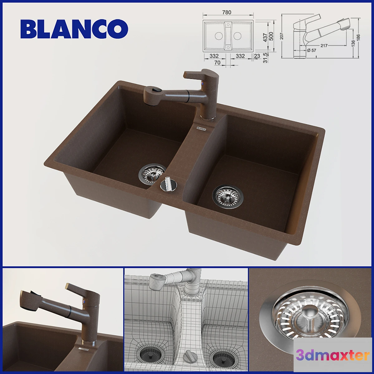 Kitchen sink and faucet Blanco. ModifikatorTurboSmooth stack. Model in real size. 3ds max 2010 version and up V-ray FBX. Texture in the archive