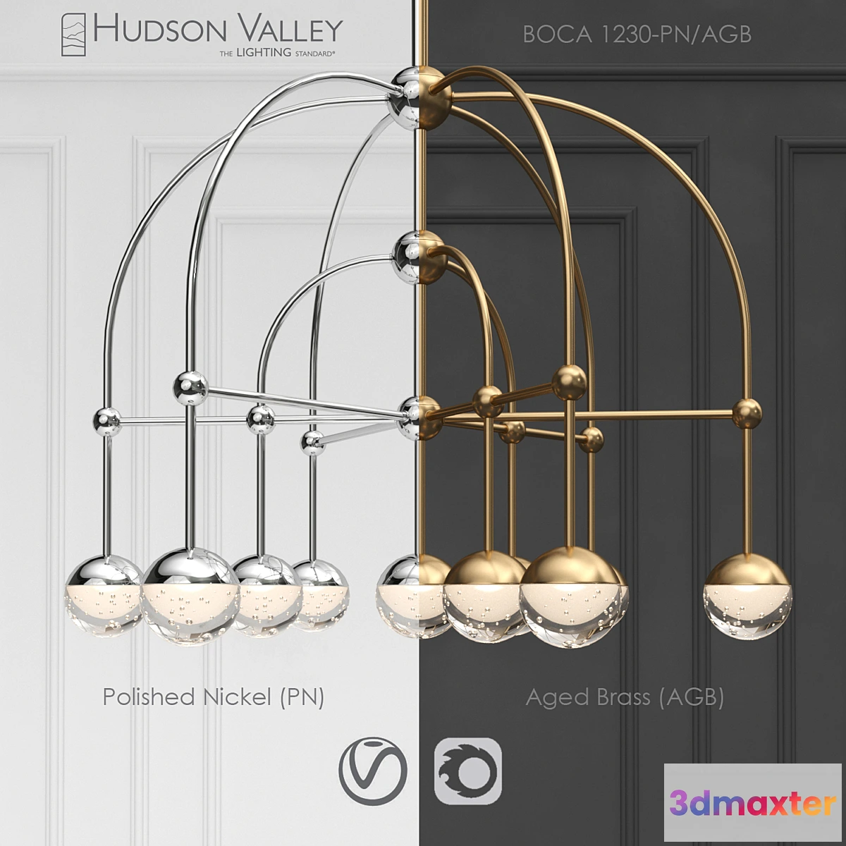 The Hudson Valley BOCA 1230-PN / AGB chandelier is available in two versions polished nickel (PN) and brass (AGB). The model is executed by one object with the assigned Multi / Sub-Object material. To choose an embodiment it is enough to simply change Material ID: 1- polished nickel 2-brass. Overall dimensions: D 784 mm H 1000 mm.