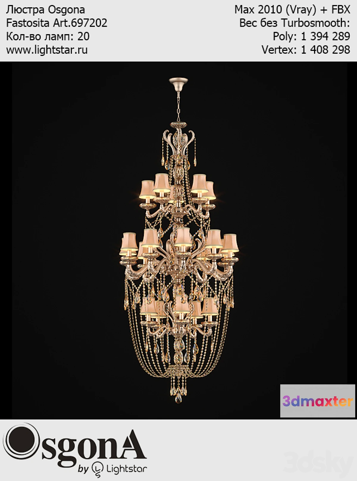 Chandelier Osgona Fastosita Art.697202 Number of bulbs: 20 www.lightstar.ru Mach 2010 (Vray) + FBX Weight without Turbosmooth: Poly: 1394289 Vertex: 1408298 Hi-poly. The material exhibited crystal dispersion which increases render time if not necessary – disconnect. Note from Lightstar: “The model comes order”