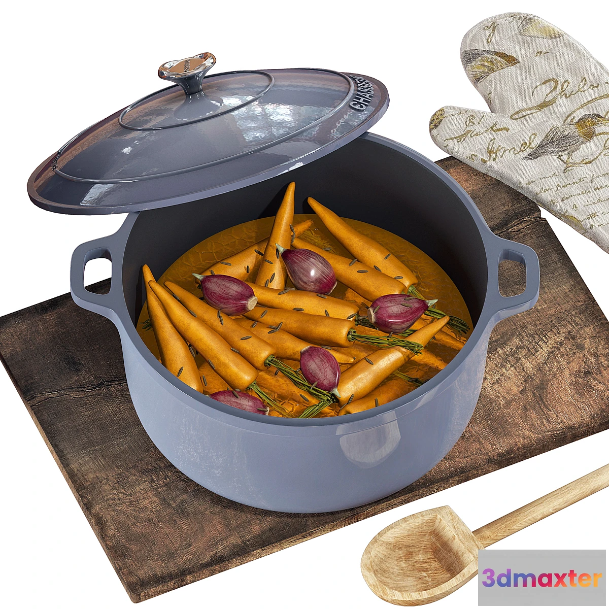 The set includes a Chasseur France saucepan cutting board wooden spoon and mitten. As a filling stewed carrots with garlic.