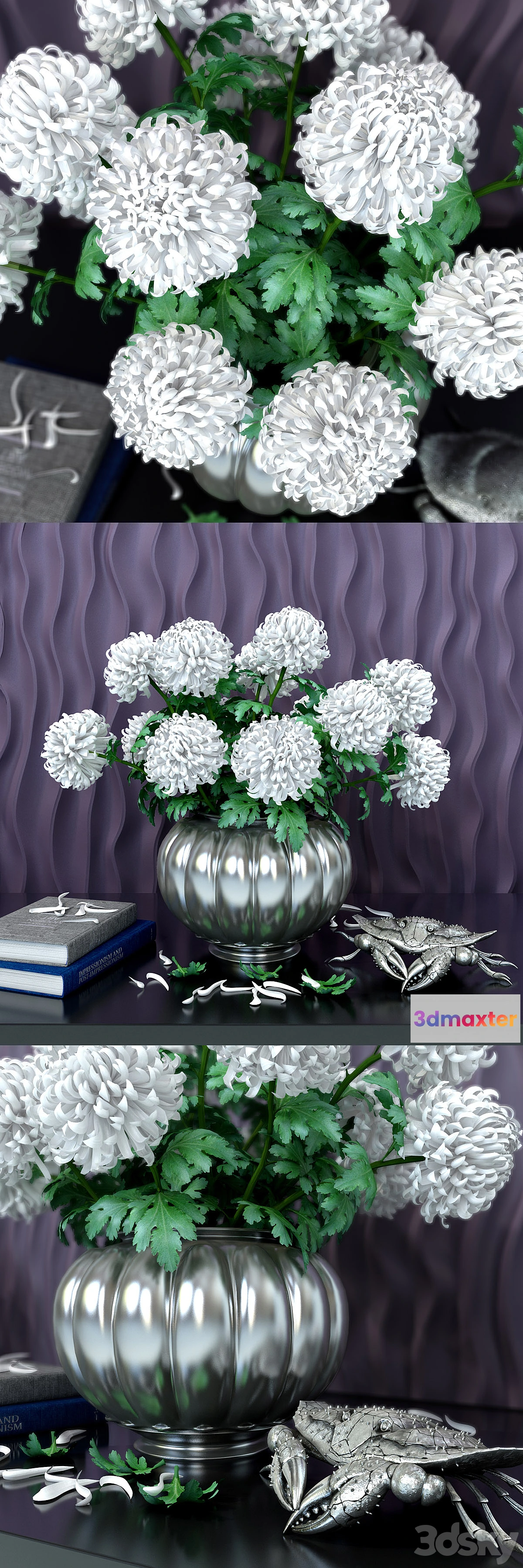 Bouquet of white chrysanthemums with large decorative silver crab and a stack of books in a fabric cover. Chrysanthemums in Japanese culture is the symbol of happiness and generosity. Silver crab sculpture gives the composition complete. Rear model with optimized grid thorough scan a unique texture! For convenience the model is better to translate the bouquet in the proxy other objects including a wall made in 3d lowpoly open stack. The model is made in the max2014 and resave for max2009 max2014 library