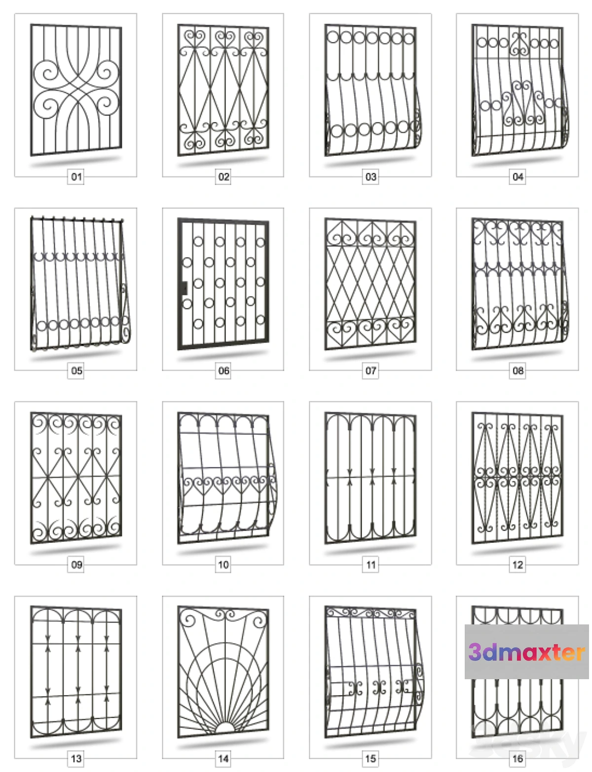 Set welded gratings for windows. Window Size: 1300h1700mm. Material bezteksturny. Number of models: 69. In the archive: Catalog – PDF Model: MAX and FBX Renders: JPEG