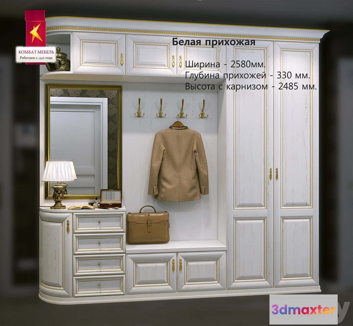 Wardrobe in the bedroom from the company Kombat. Advantages: Compact but at the same time very functional furniture hallway in a classic style. Tumba chest of drawers and curved dresser with mirror decorate your hallway. Spacious mezzanine. Site http://www.kombatt.ru/ Polygons much. Model without decoration.