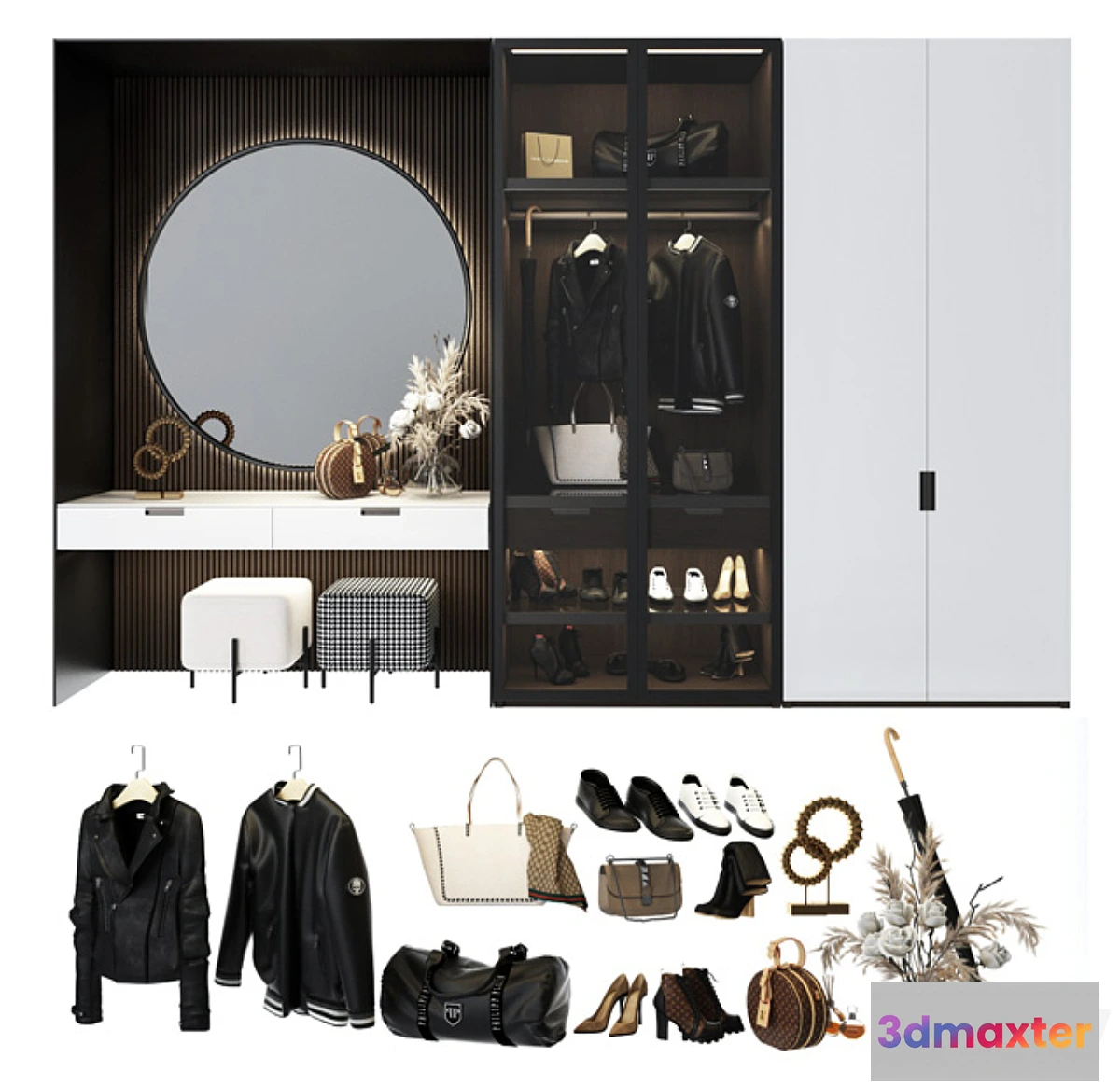 Composition in the hallway or bedroom made to order module with transparent doors from Poliform poufs Elefante Sankal. Bags and shoes – copies of Valentino and LV and other brands. The file is conveniently edited light sources for illumination are present.