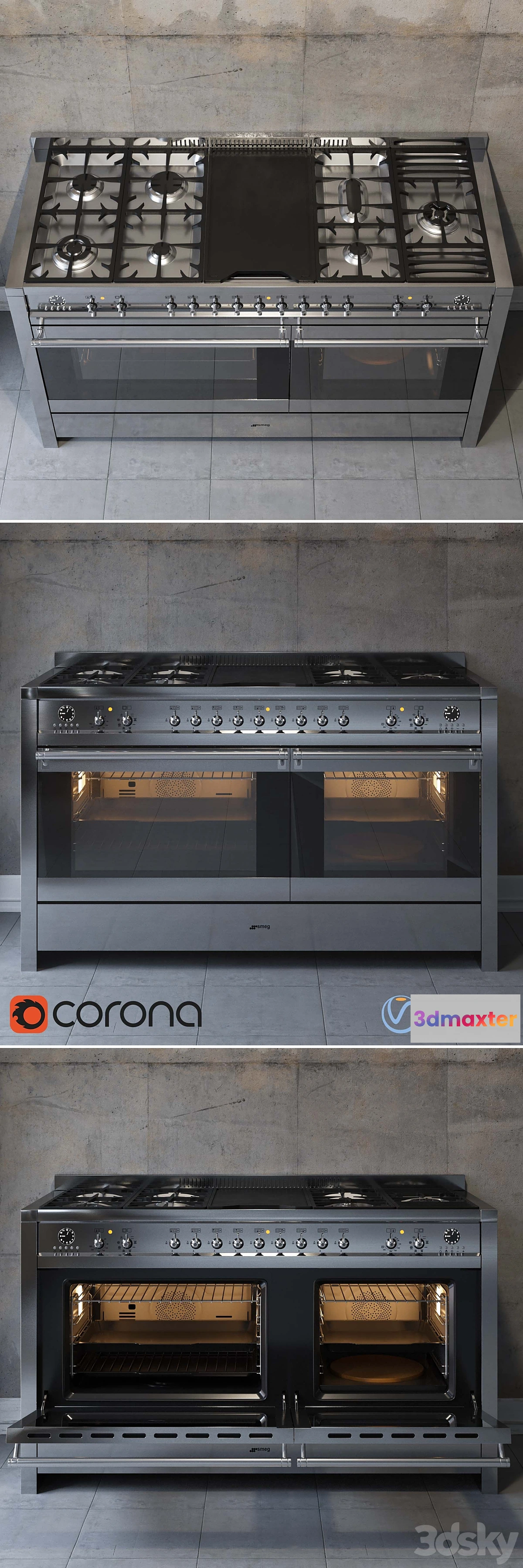 Detached Cooking centers Smeg A5-8 Series Classica at 150cm. Two choices of materials: stainless steel and anthracite. Archived: texture with the individual title in English. 2014 + Corona + FBX Warning !!!! For Vray only file MAT the name of the material corresponds to the name of the object in the file. Configured animation to open the door. The model prepared by smoothing.