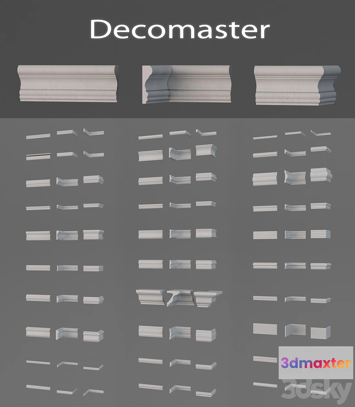 The collection contains 30 moldings from the manufacturer Decomaster. Each molding is a spline with a Sweep. In the Map there are images with relevant articles.