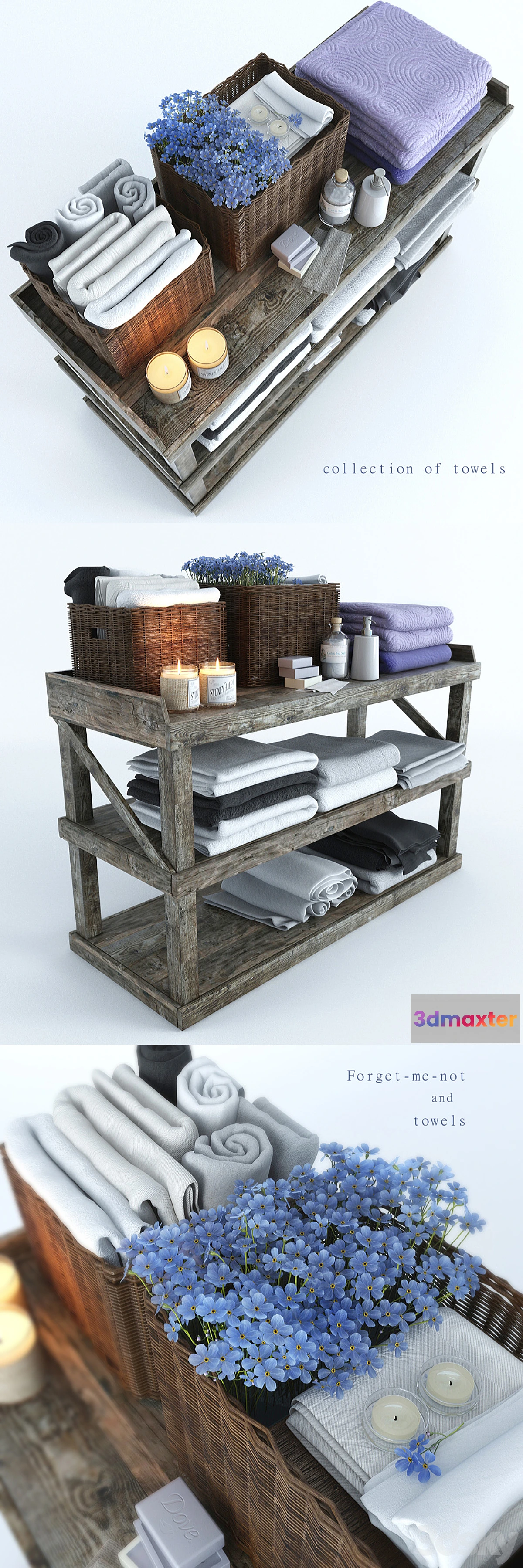 The kit includes: dresser 24 towels a bouquet of flowers – forget-me two baskets of rattan two candles soap sea salt and shower gel Fbx archive. Polys: 763752 Verts: 705411