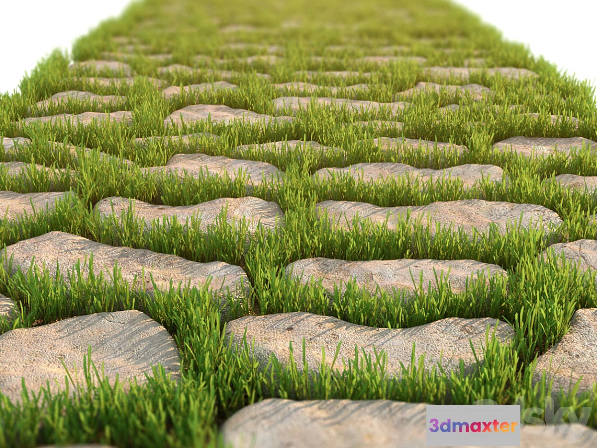 Decorative stone and tiled path overgrown with grass.