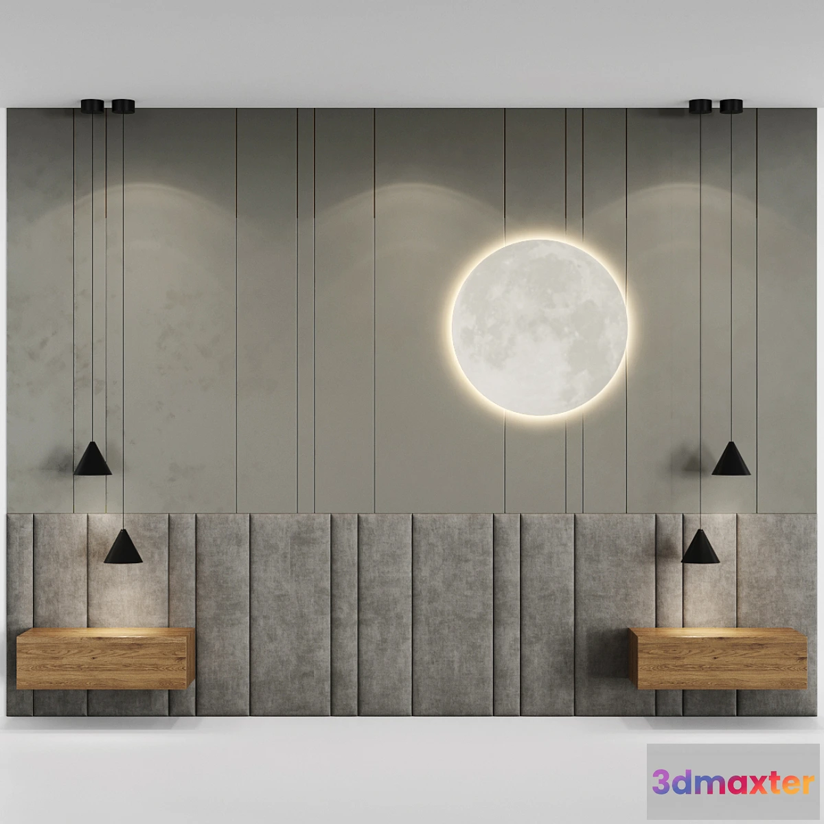 Wall decorative panel made of MDF / laminated chipboard and fabric. Headboard. Bedside tables. Moon. Backlight. The dimensions are easy to match to your room.