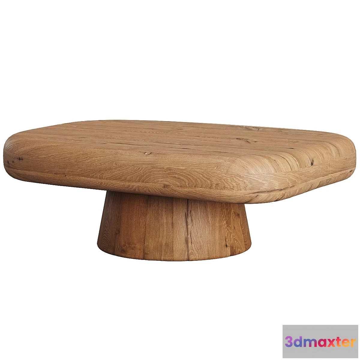 Defined by softly rounded edges and a pedestal base carved wood coffee table by Caleb Zipperer makes a striking statement with its bold proportions. Crafted of solid acacia wood the table is wirebrushed and stained to a matte walnut finish to highlight the wood’s organic texture and rich grain pattern.
