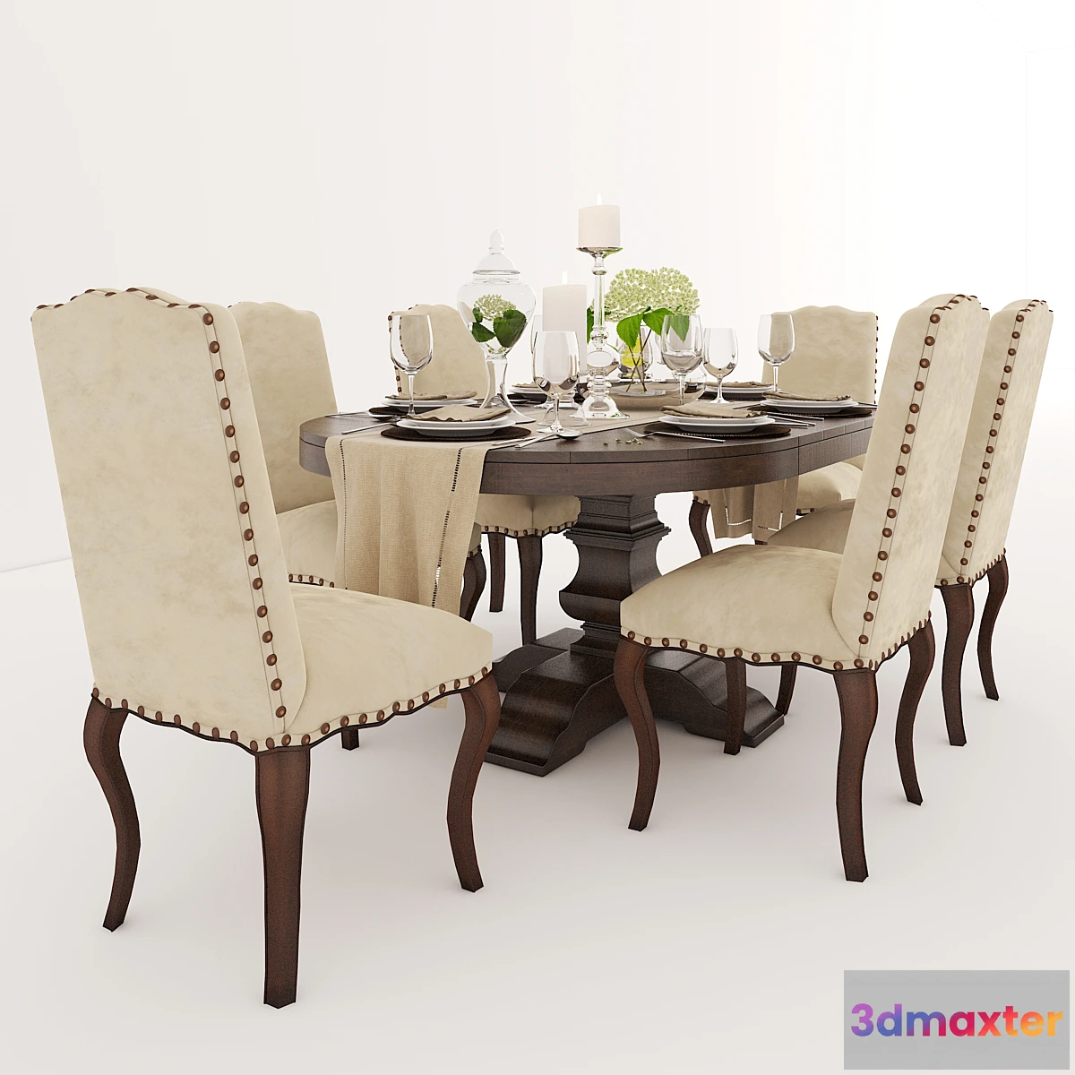 Group dining table from Pottery Barn: http://www.potterybarn.com/products/banks-extending-pedestal-dining-table/?pkeyctables%7Cround-tables chair: http://www.potterybarn.com/products /calais-upholstered-nailhead-dining-chair-quick-ship/?pkeycchairs-furniture%7Cchairs&isx0.0.2800 vase: http://www.potterybarn.com/products/voluminous-camilla-canisters/?pkey cvases & isx 0.0 candlesticks: http://www.potterybarn.com/products/addison-glass-candle-holders/