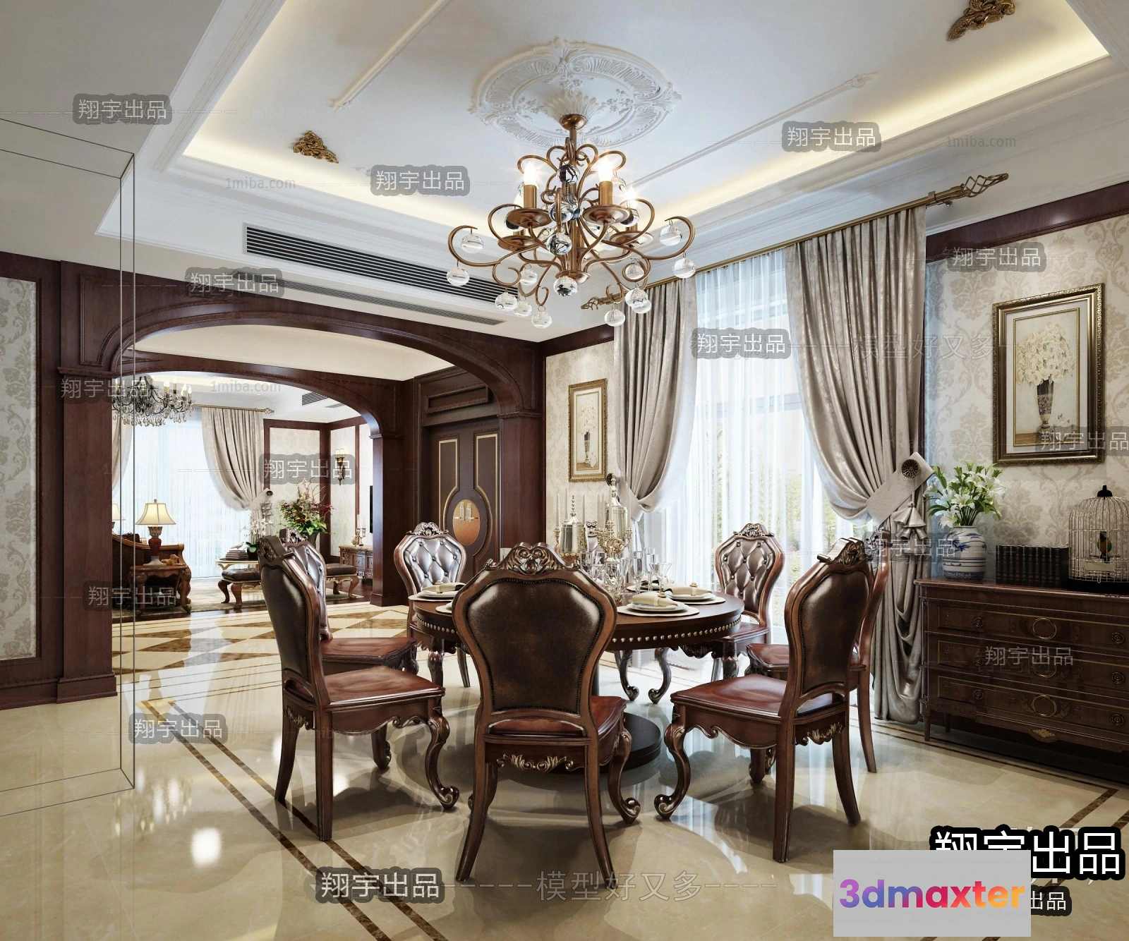 3D Models / 3D Scenes / Interior / Dining Room / Dining Room 3D Interior Scene Model – European Style – 022 3D Max