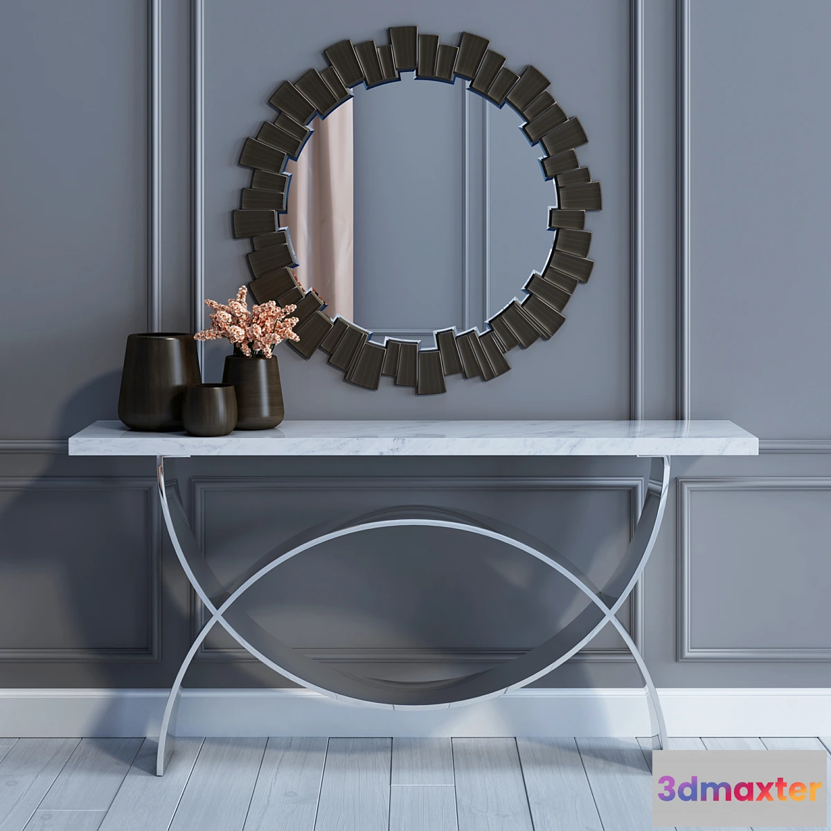 Console table finished in chrome and white marble Dimensions: w.160 x d.45 x h.76 cm * decor included