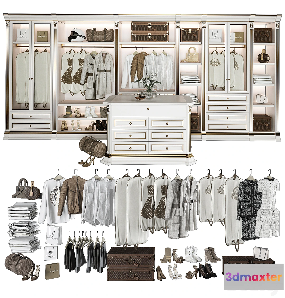 Benedetti luxury wardrobe size 5800 * 600 * 2650. Presented at: https: //www.kitchen-ceramica.ru/brands/benedetti/benedetti_luxury/ The model can be easily edited. Light sources for illumination are present.