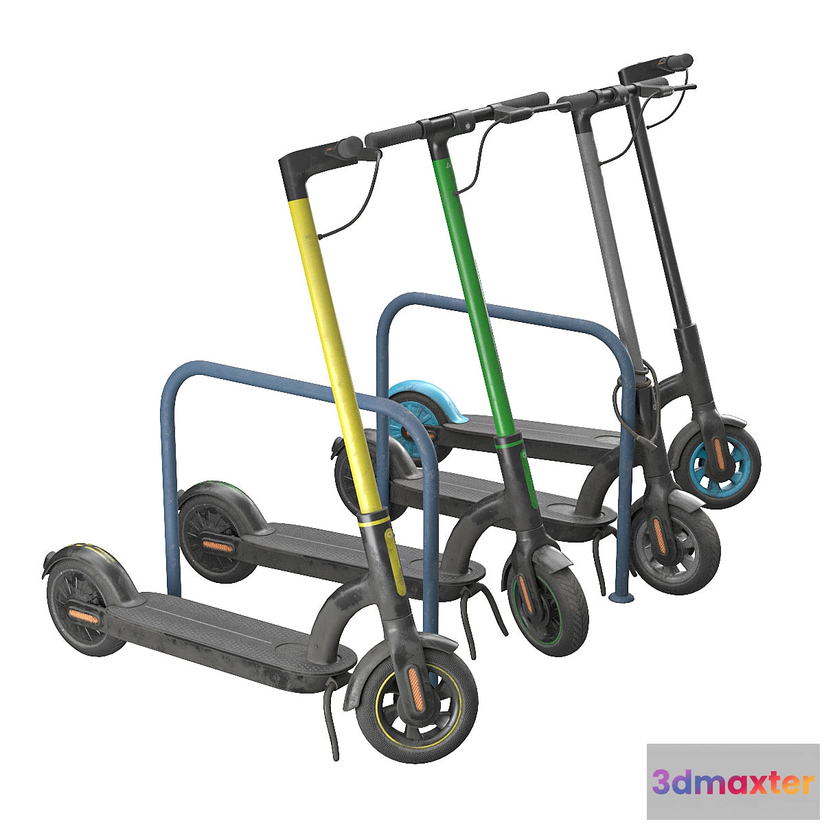 Four electric scooters in yellow green gray and blue two parking stands and one lock.