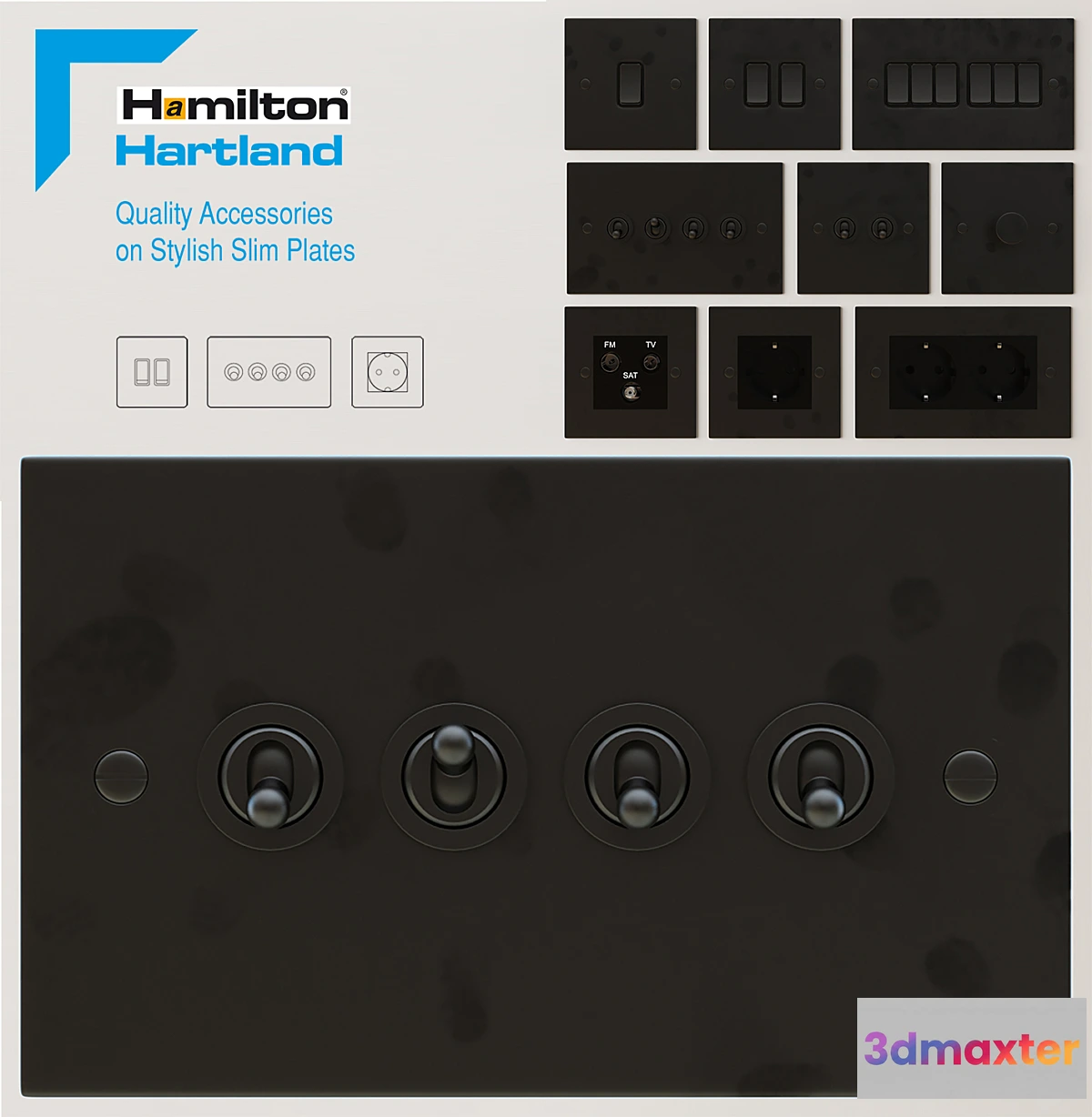 Elektrofurnitura – Hamilton – Hartland Factory: Hamilton Collection: Hartland Color: Graphite (NCS) Models: R21 R22 R23 R24 R26 T21 T22 T24 8GP 12GP 1×40 DTRID 6126 26126 Factory website: http://www.hamilton-litestat.com Models are made by Sizes from the technical catalog. For full realism fingerprints have been added. This texture can be turned off. The Turbosmooth modifier is left in the hierarchy which will allow you to adjust the intensity of anti-aliasing. Link to the collection: http://www.hamilton-litestat.com/decorative-wiring-accessories/hartland/Â