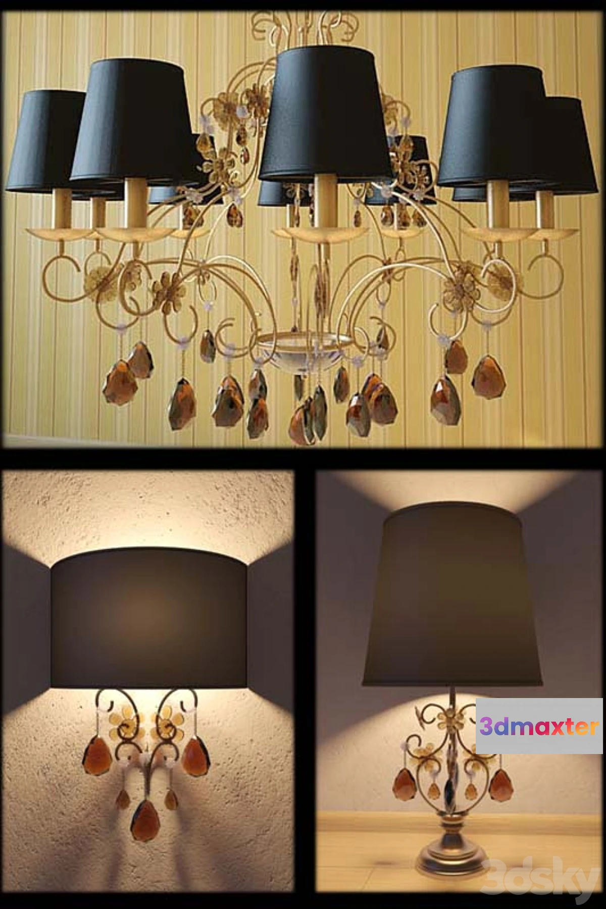 In the three-lamp chandelier sconces and table lamp. All materials are configured. High detail model but everything worked out and a little differences from the original.