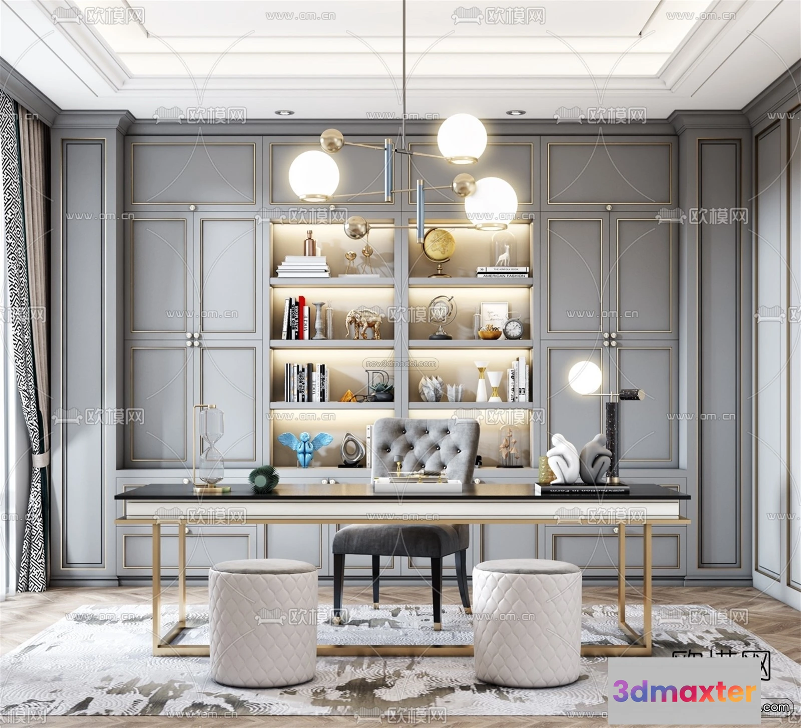 Europe Style Interior 3D Blocks – Study Room 3D Model – 344 – Office Home 3D Model – VRAY