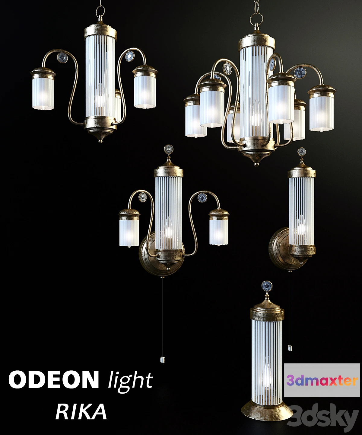 Fixtures Odeon Light RIKA for residential and public buildings. Ceiling lamps made of frosted glass. Sconces have switch with drawstring. Lamp luminaires are designed to “candle” E14 40W max. Coating color: bronze. Materials Corona