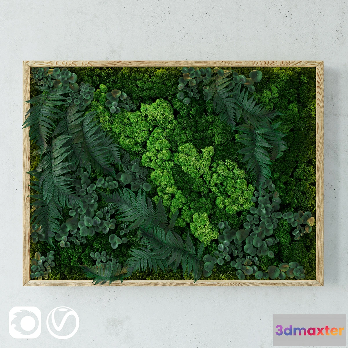 Phytosten with LED backlight. Composition: moss fern pepermia. Dimensions: height 87.5cm width 117cm depth 7cm polys: 191 696 verts: 194 975 The archive contains Max files in corona and vray also fbx files all textures and previews. The paths to all textures are erased the turbo blurry in the modifier stack is disabled.