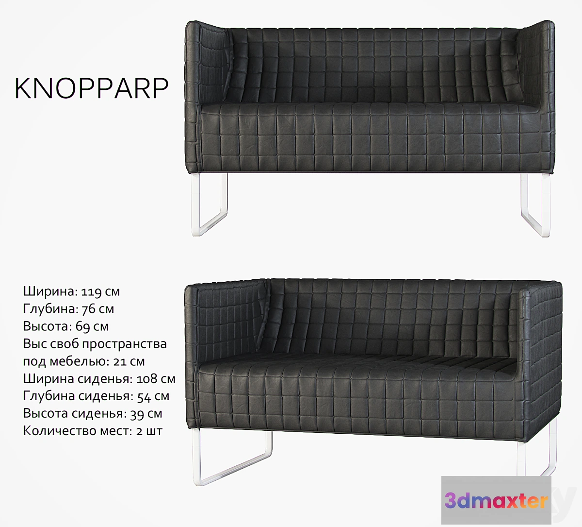 KNOPPARP 2-seater Sofa Dimensions Width: 119 cm Depth: 76 cm Height: 69 cm Height svob space under furniture: 21 cm Seat width: 108 cm Seat depth: 54 cm / 54 cm Seat height: 39 cm Number of seats: 2 pcs Designer : Nike Karlsson http://www.ikea.com