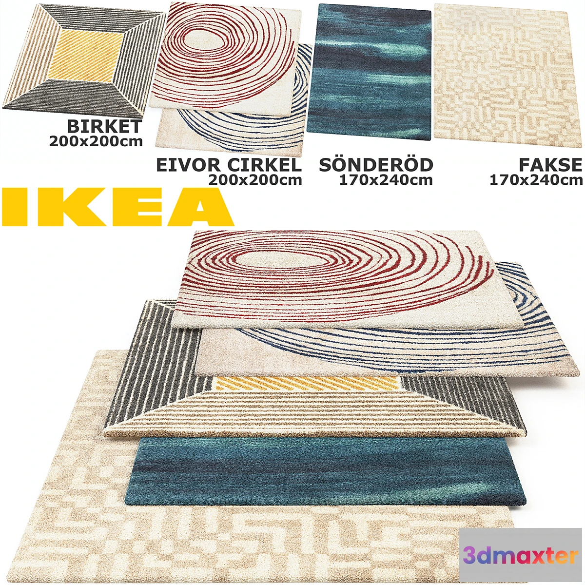 IKEA BIRKET EIVOR CIRKEL SÖNDERÖD FAKSE (Birket Avary SЁNDERЁD fax) RUGS SET High pile rugs set. Each models have two type of the shape (square rectangle). Materials placed on ID channels (1-birket 2-eivor cirkel red 3-eivor cirkel blue 4-sönderöd 5-fakse). Rugs made with VRayDisplacementMod. Archive contain MAX (2011) FBX (2009) Obj files.