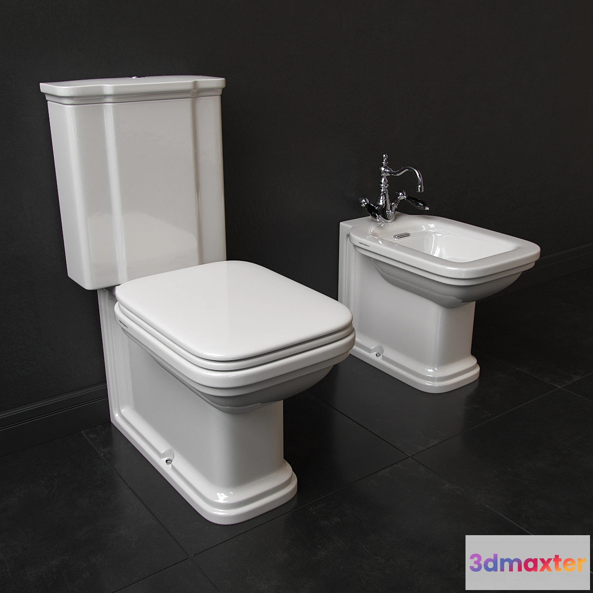 The toilet and bidet from the collection of the Waldorf Kerasan Kerasan Italian factory. Dimensions: toilet art. 4117 (W * D * C) 400 * 680 * 875; bidets art. 4121 (W * D * C) 370 * 550 * 420. The archive is a performance library materials: chrome and gold.