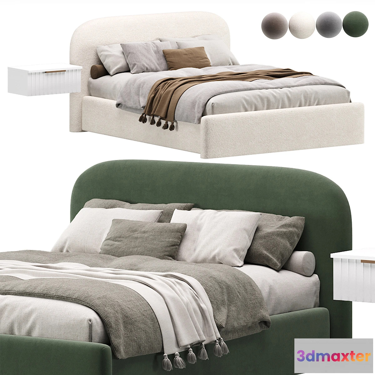 The Kevia Bed 3D Model is a three-dimensional representation of a contemporary bedroom furniture piece, featuring an upholstered frame design with coordinated bedding elements. This digital model showcases a modern sleeping solution with customizable frame colors, including cream and green options, complete with detailed white and gray bedding, decorative brown throw, and integrated side shelf functionality for enhanced bedroom aesthetics.