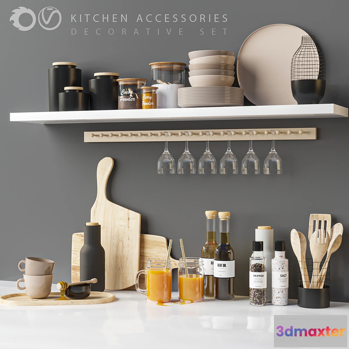 A kitchen accessories set for interior design. It is suitable for kitchen. All objects in the scene are logically named. The archive file Max 2016 (Corona + Vray) Fbx (Corona + Vray) and textures.