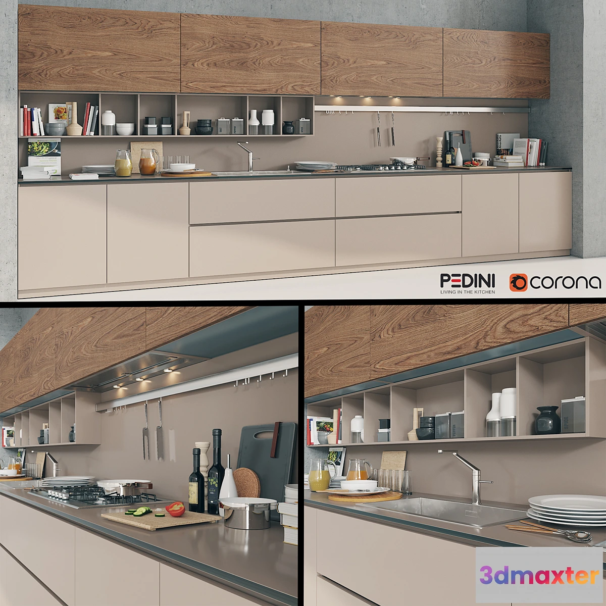 Kitchen Pedini Arke. Dimensions 4800×2100 mm (WxH). In the scene there is everything that is visible on the renderer. Http://www.pedini.it Polys: 717686. Pleasant use.
