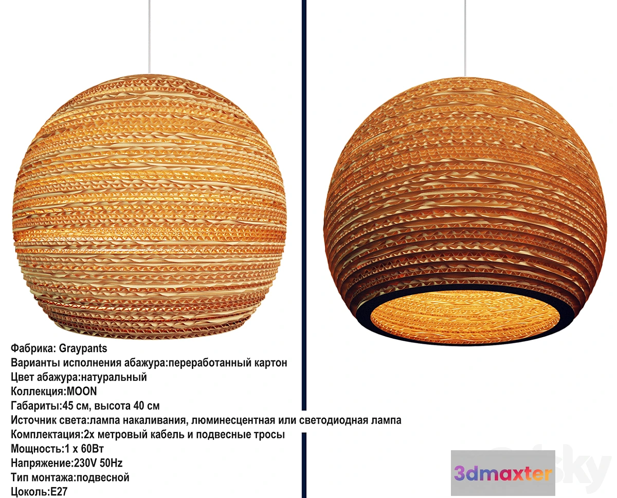 Factory: Graypants Country: United Kingdom versions of the lampshade: recycled cardboard lampshade Color: natural collection: MOON Dimensions: 45 cm height 40 cm Light source: incandescent fluorescent or LED lamp Options: 2x meter cable and suspension cables Power: 1 x 60W Voltage: 230V 50Hz Mounting Type: Hanging Cap: E27 Shop: http: //www.osvetim.ru/shop/product/graypants-moon-18.html