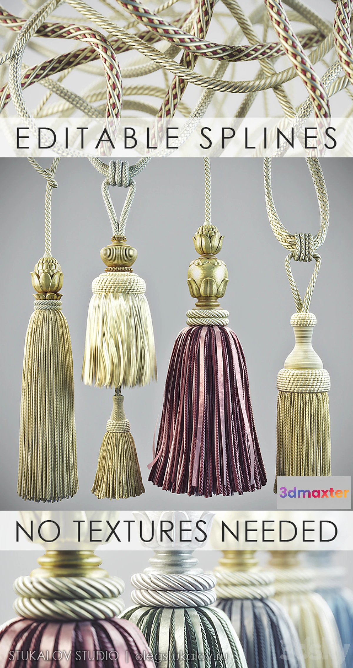 ALL picked up – editable spline with the correct texture coordinates. You can add and move points to attach other splines tie them up in knots and do not be afraid of the distortion of texture coordinates. NOT REQUIRED TEXTURE! All materials are created using a treatment card and thus realistic look magnificent. You simply add your favorite brush in your scene and do not worry about conflicts of filenames paths scale and so on. SMALL SIZE. All low-poly model with adjustable smoothing. Each item contains