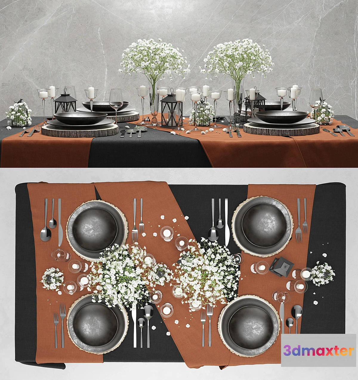 The 3ds max file contains the full scene. There are no vases with flowers in the obj file. Technically there was no way to reduce the weight of files in another way.