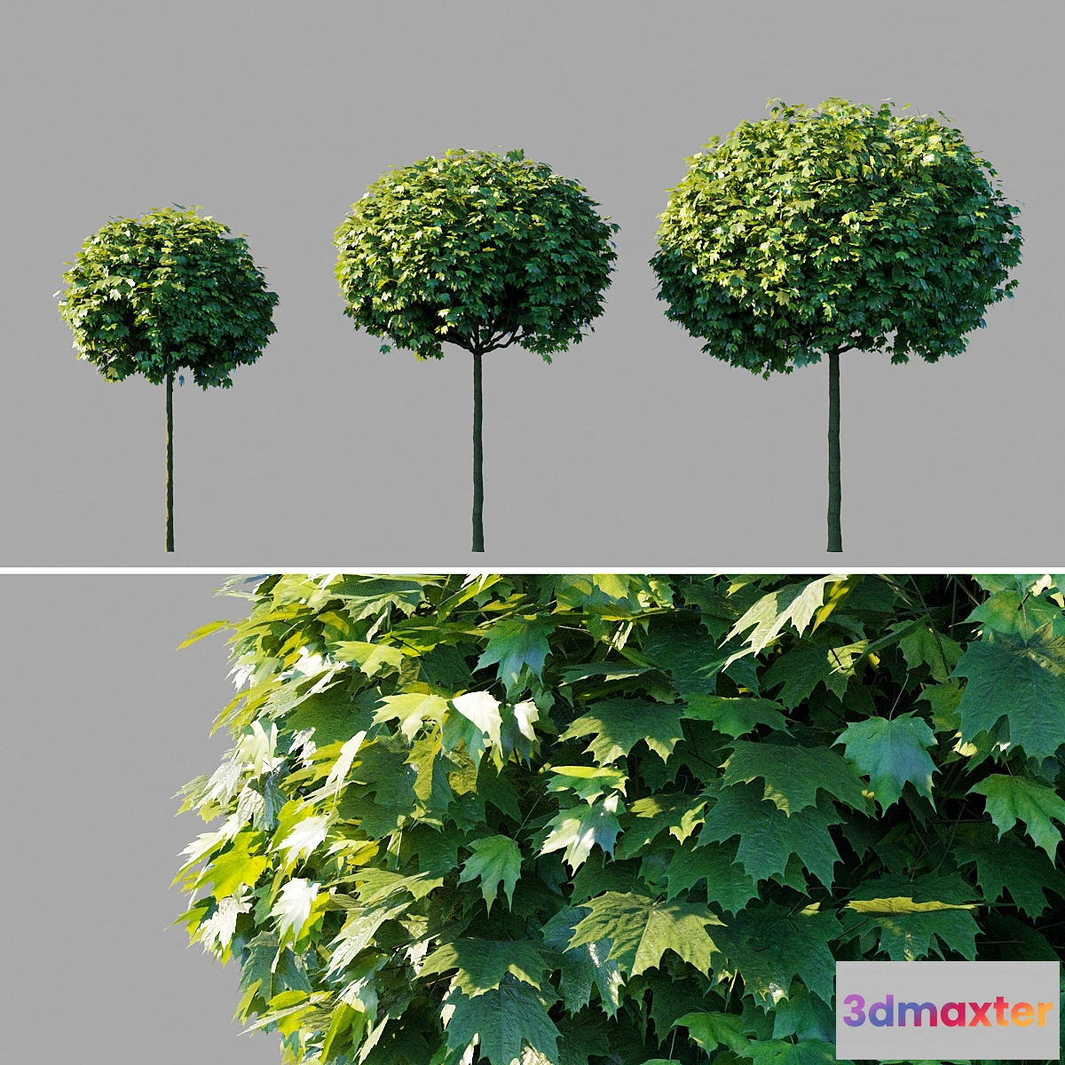 Maple acutifoliate Globosum (Acer platanoides Globosum). A collection of three trees of different heights and diameters: