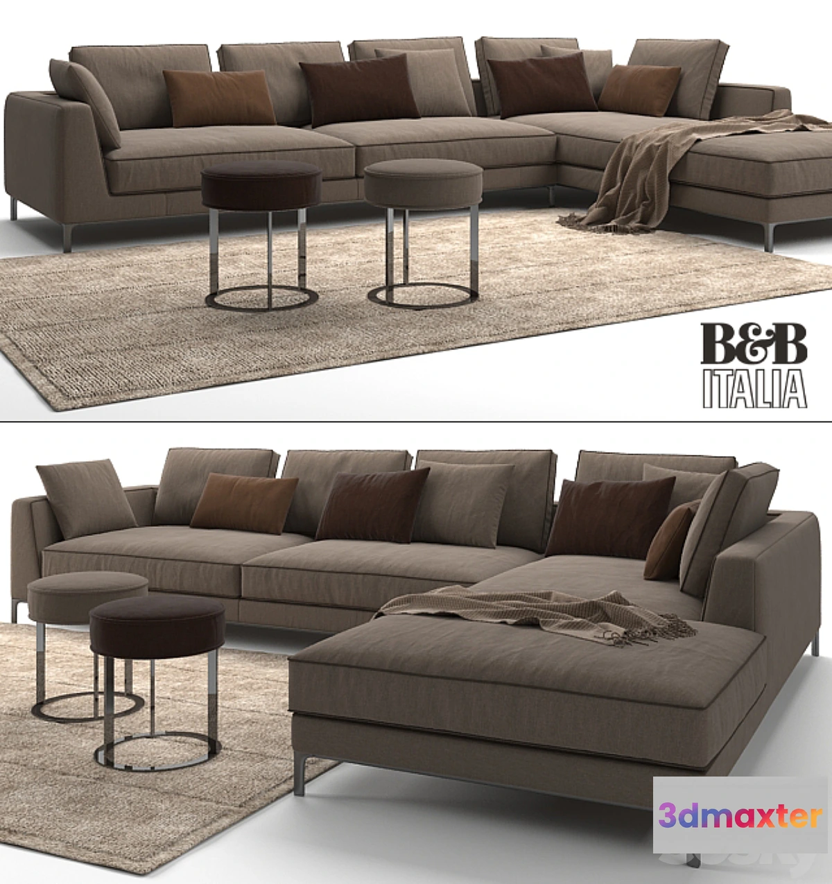 MAXALTO B & B ITALIA Lucrezia ‘To Size’ Sofa Length 367 cm Width 249 cm Height 62 cm Lithos Pouf by Maxalto Height 45.5 cm Diameter 40 cm Carpet CRATIS B & B Italia 200 cm x 300 cm