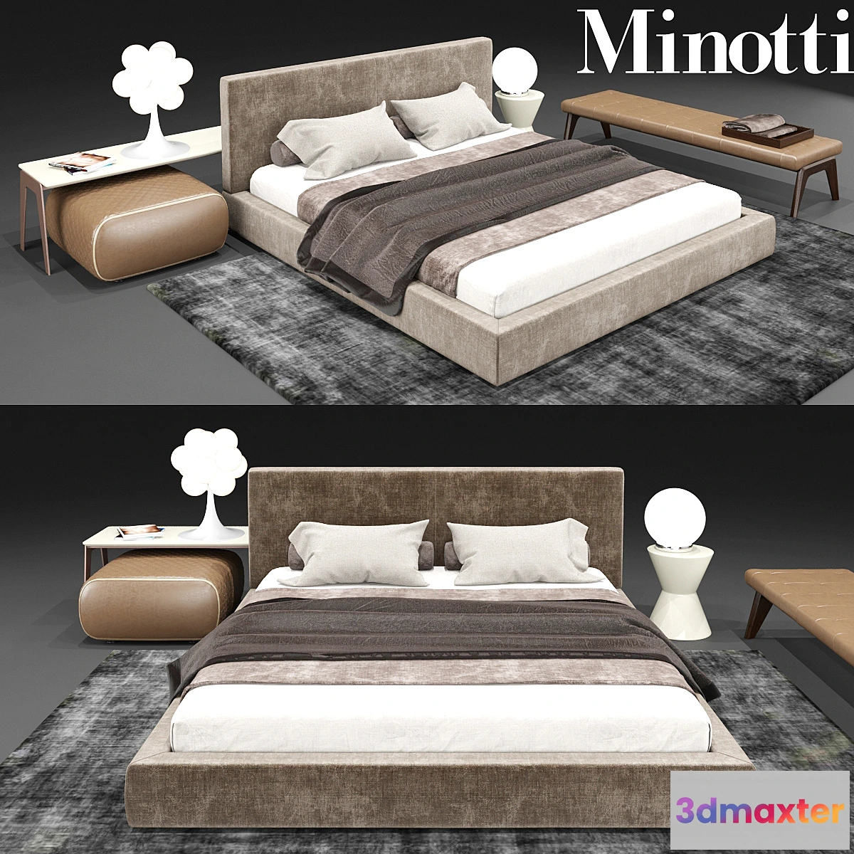 Bed – Bartlett – 2020h2230h900N Ottoman – Ashley – 750h750h360N Atamanka – Kirk – 1835h550h380N Console – Kirk “Console” – 1800h450h470N table – Cesar – 360h360h450N lamp – De Majo “Babol T” – 450h450h620N