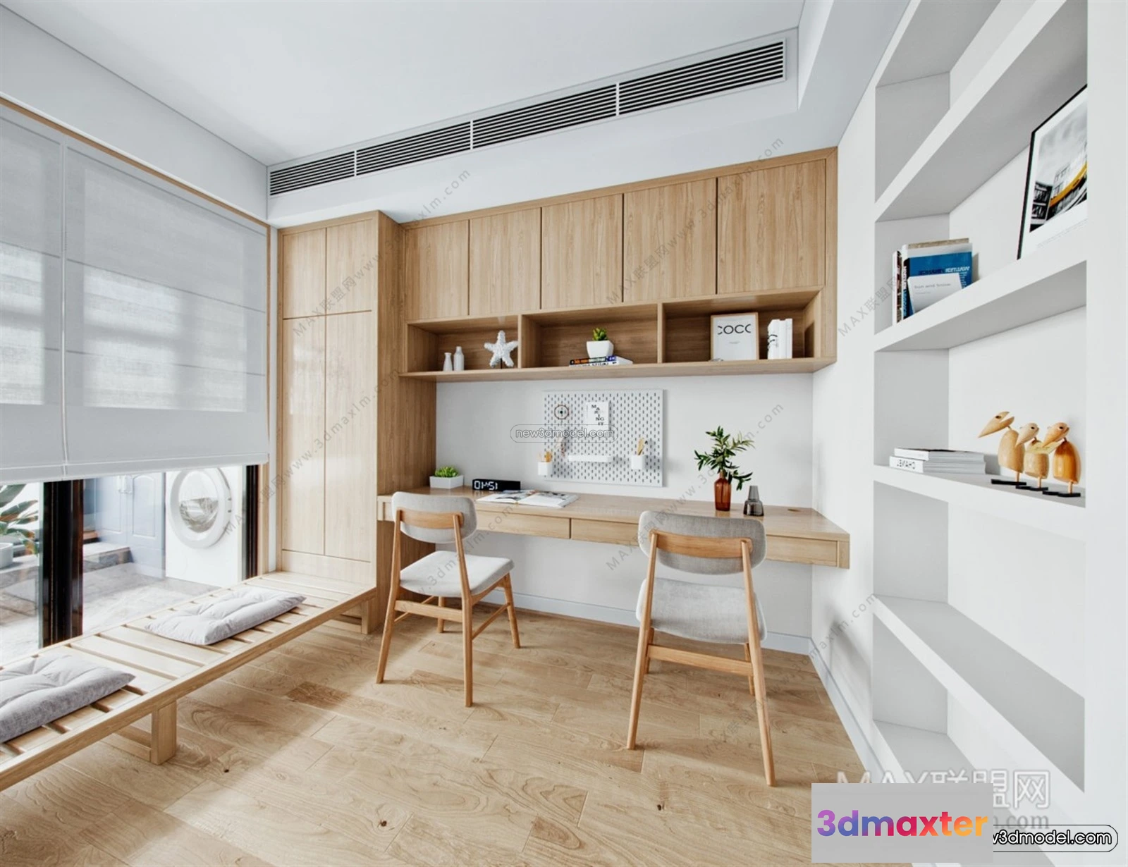 3D Models / 3D Scenes / Interior / Office Home / Nordic Style Interior 3D Blocks – Study Room 3D Model – 474 3D Max