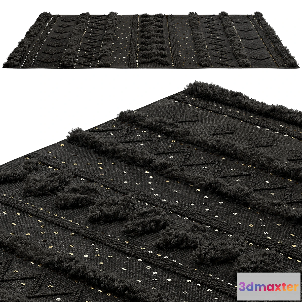 Black wool carpet in boho style completely made of geometry.