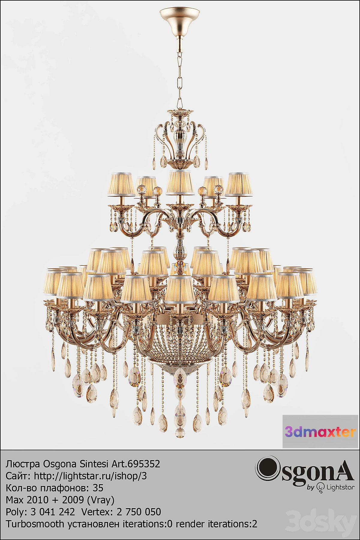 Chandelier Osgona Sintesi Art.695352 http://lightstar.ru/ishop/3Â lampshades Qty: 35 Max 2010 + 2009 (instead of FBX) + VRay Poly: 3041242 Vertex: 2750050 Turbosmooth set iterations: 0 render iterations 2 Hi-poly. The material exhibited crystal dispersion which increases rendering time in a few times if not needed – disconnect. Note from Lightstar: “model comes under the order”