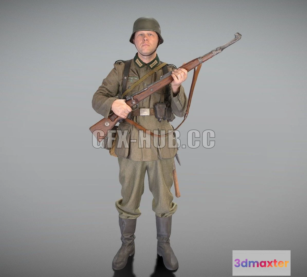 - Name: PBR Game 3D Model – Fully equipped German soldier with gun 344