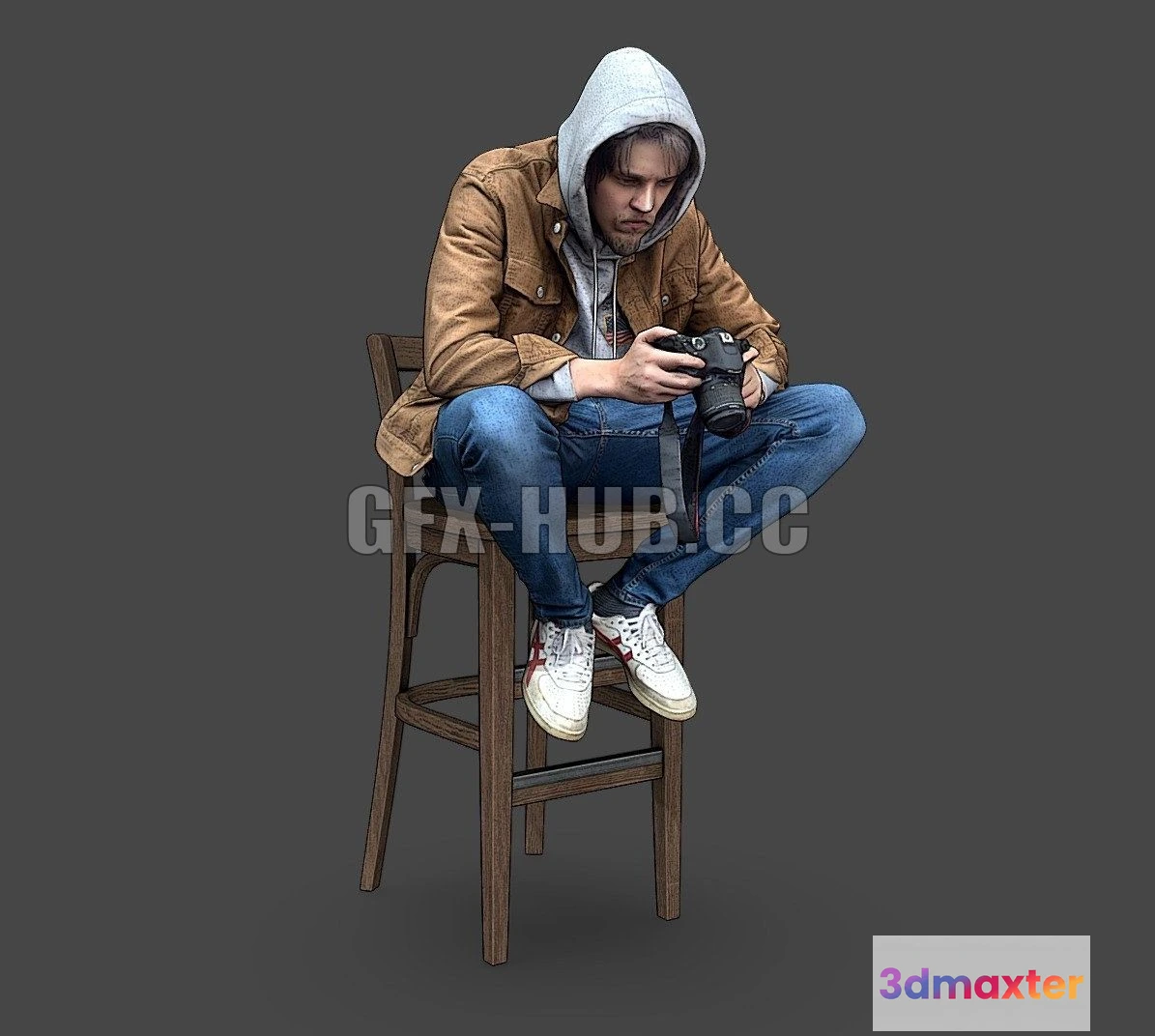 - Name: PBR Game 3D Model – Guy with a camera sitting on a stool