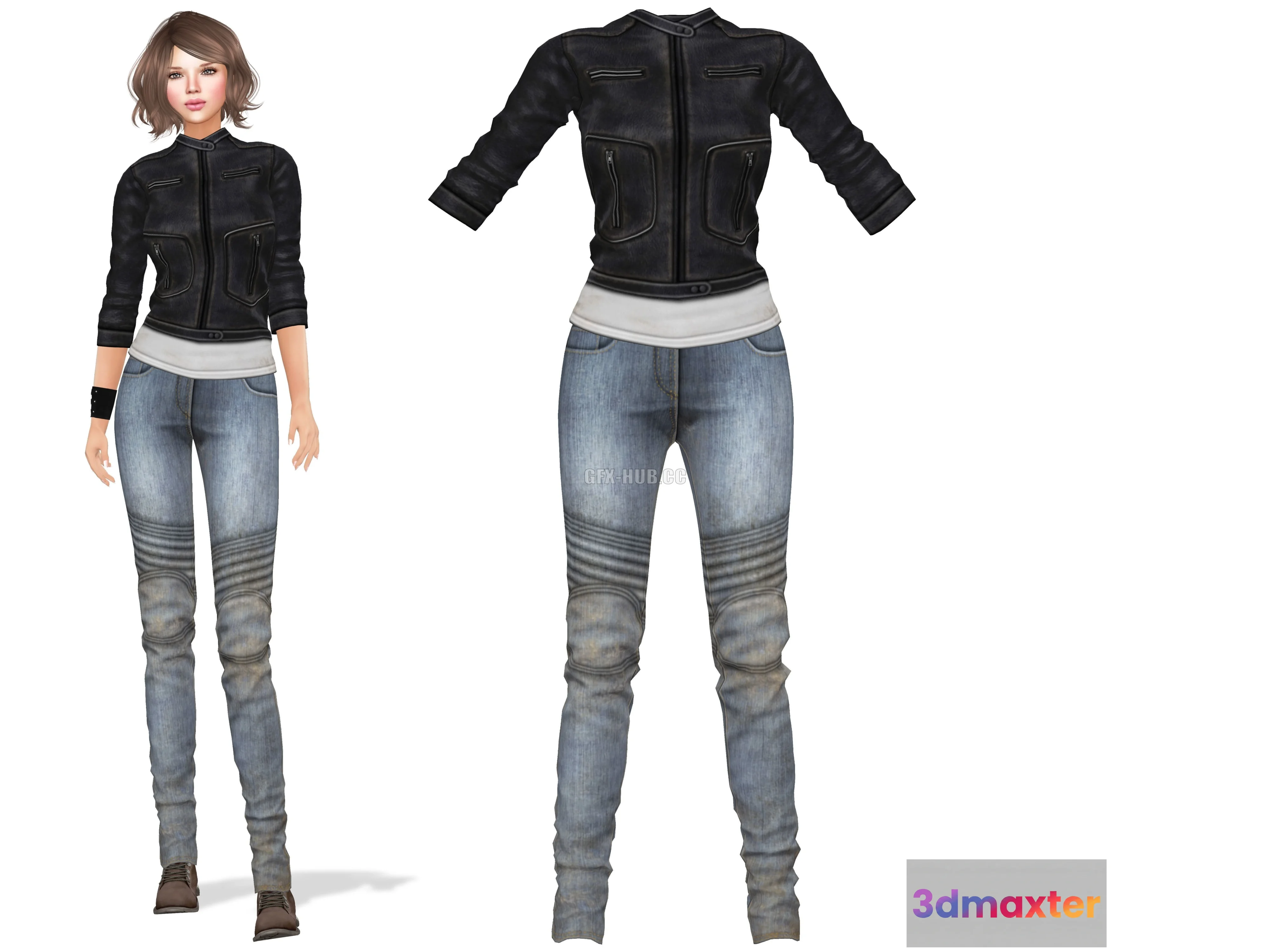 - Name: PBR Game 3D Model – Jeans Leather Jacket Female Outfit