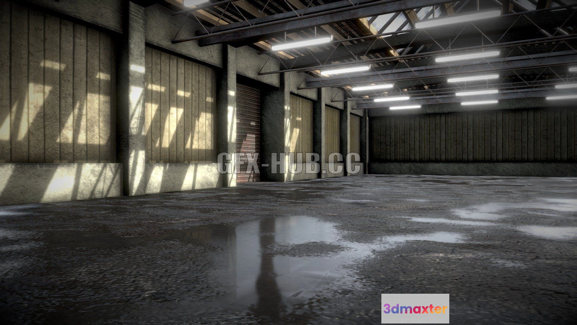 - Name: PBR Game 3D Model – Old Warehouse (Wet Asphalt Ground)