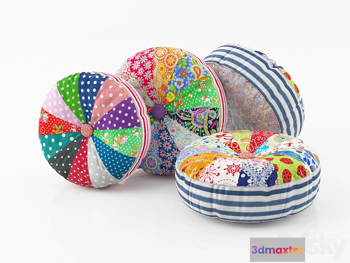 Bright fabric beanbags made in rustic style of the calico and cotton rags. They can be used in some scenes as the soft puffs.